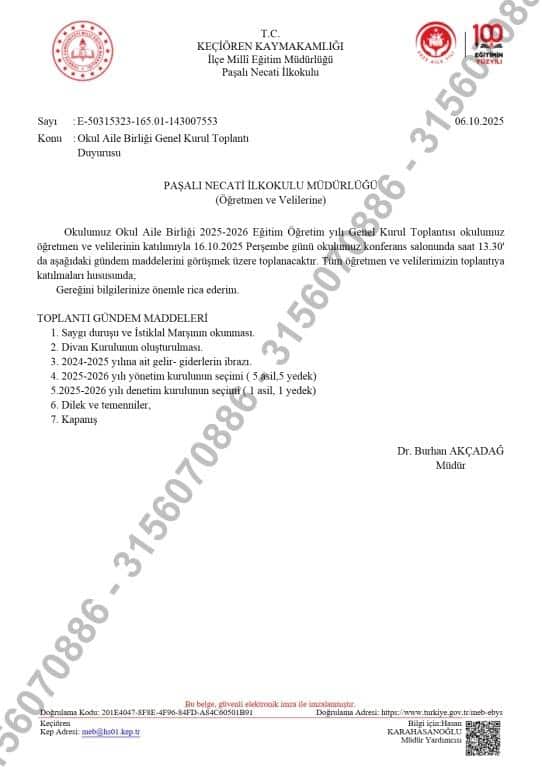 Okul Aile Birliği Olağan genel Kurul Toplantısı 16.10.2025 tarihinde Okul çok amaçlı salonunda saat 13.30 de yapılacaktır. Tüm Velilerimize önemle duyurulur...